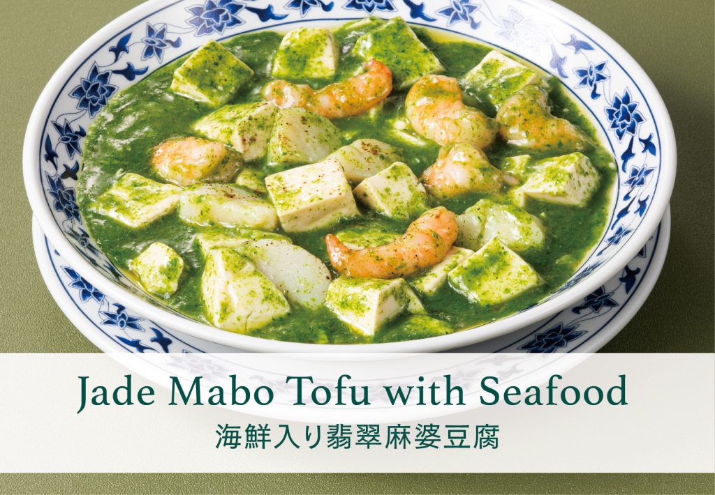 爽やかな辛さの翡翠ソースで鮮やかな緑色に。海老や帆立の旨味をプラスし、青山椒の香りをまとわせました。