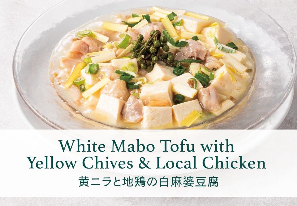 鶏モモ肉の優しい味わいとねぎの香りに包まれた、まっ白な麻婆豆腐。さっぱりとした辛味は青唐辛子で。